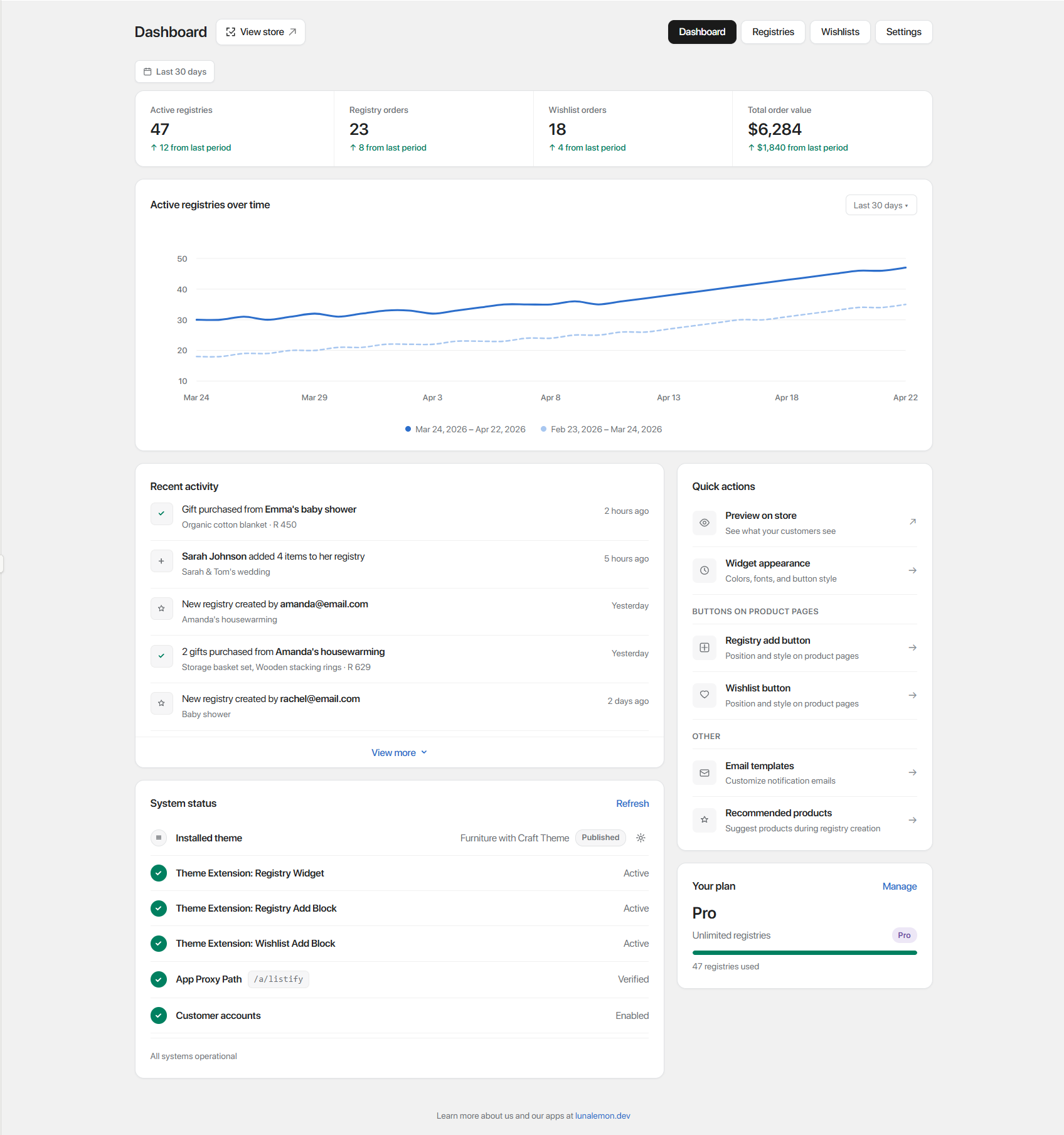 Active registries, gift orders, and revenue — over time, alongside your collections. See exactly which registries pull new customers in.